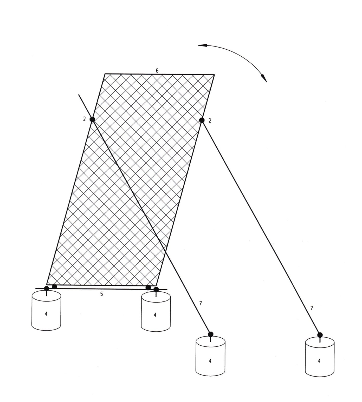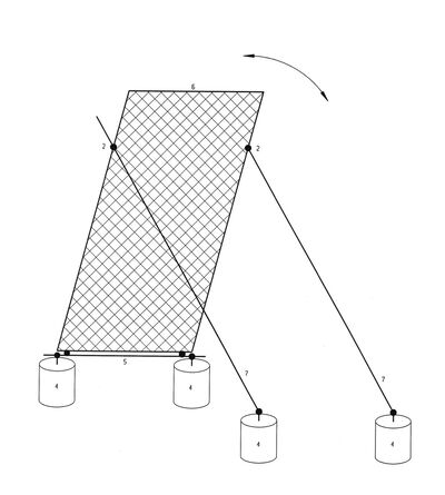 Die Überlegungen gingen weiter. In der nächsten Version ist der Nebelfänger nicht mehr beweglich, es entfällt das Gestell. Der vormalige Schwingrahmen wird fest auf vier einbetonierten Gerüstrohren mit insgesamt acht Drehkupplungen befestigt, siehe nebenstehende Skizze. Die komplette Montage bzw. Aufstellung wird ebenerdig ausgeführt, das heißt, es werden keine Leitern benötigt.