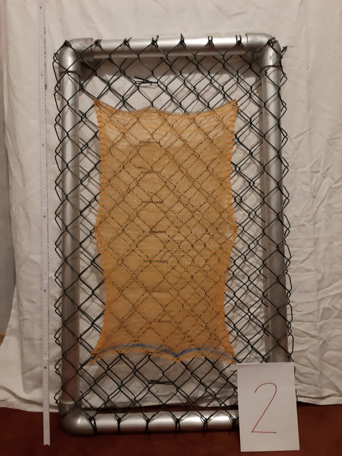 Der Schwingrahmen besteht aus vier Rohren, welche mit Maschendraht umwickelt werden. Der Maschendraht wird an allen Seiten fest um dem Schwingrahmen gespannt. Auf den Maschendraht werden beidseitig die Nebelfangnetze geknotet, siehe nebenstehendes Modell von 0,5 x 1 m.